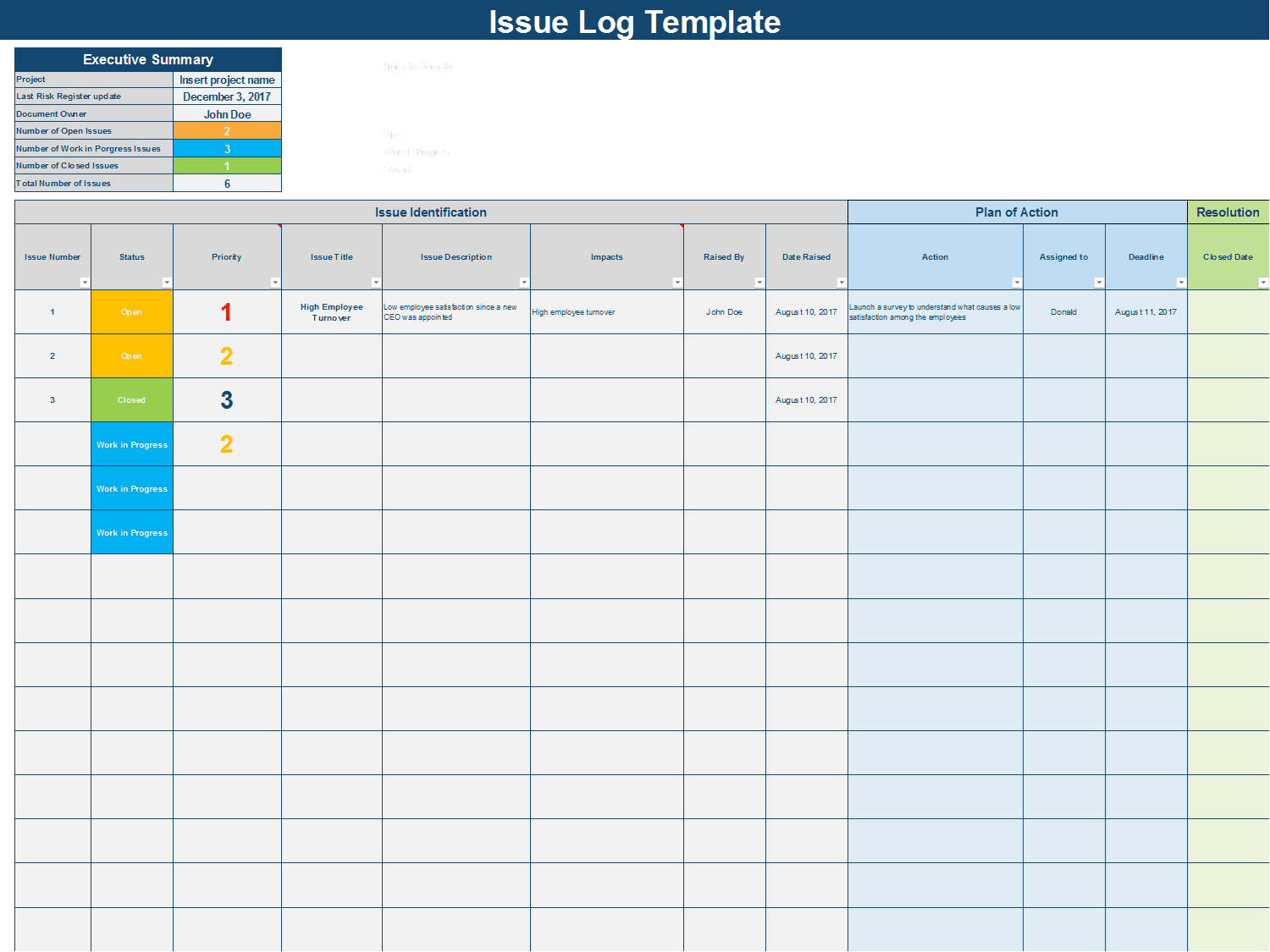 - An Issue Register Excel Template, which automatically calculates the number of "Open", "Work in Progress" and "Closed" Issues